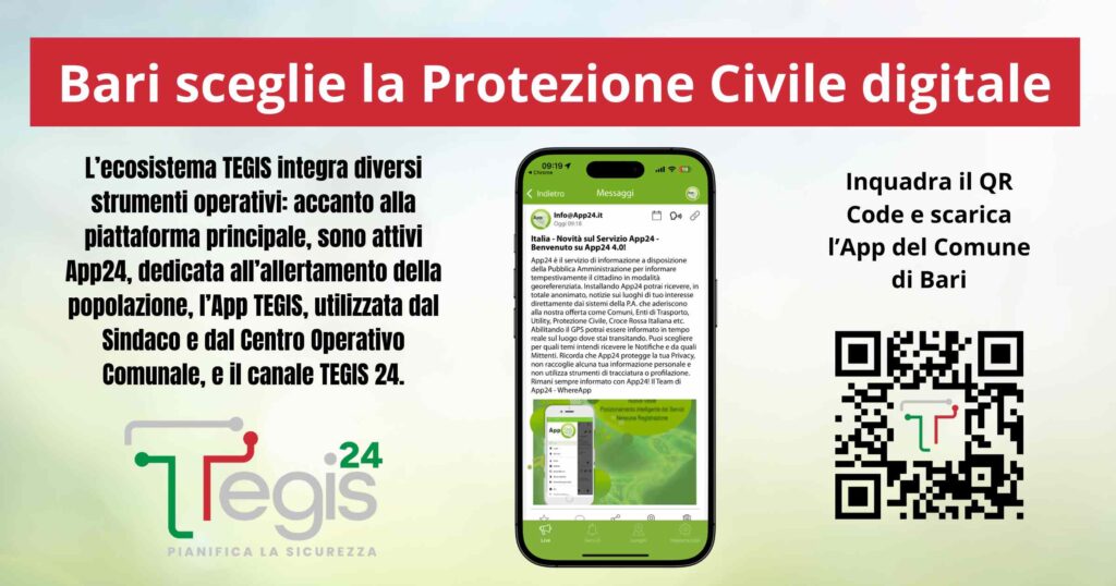 Bari, 13 marzo 2026 – La Puglia compie un nuovo passo verso una Protezione Civile digitale e integrata. Il Comune di Bari ha adottato nuove componenti della piattaforma TEGIS, completando il proprio Piano di Protezione Civile Nativo Digitale con l’attivazione del canale TEGIS 24 e della mobile App TEGIS.